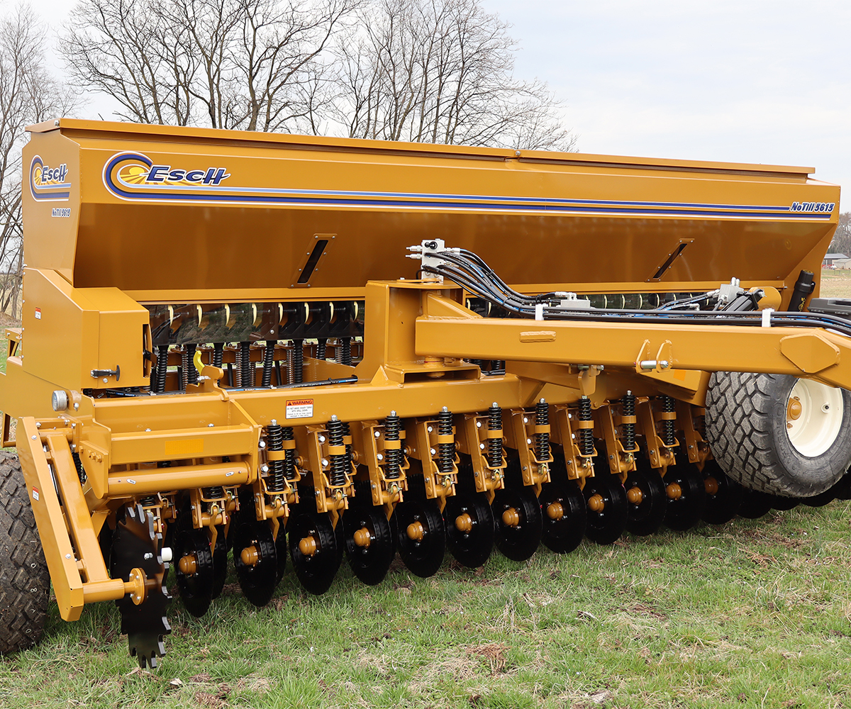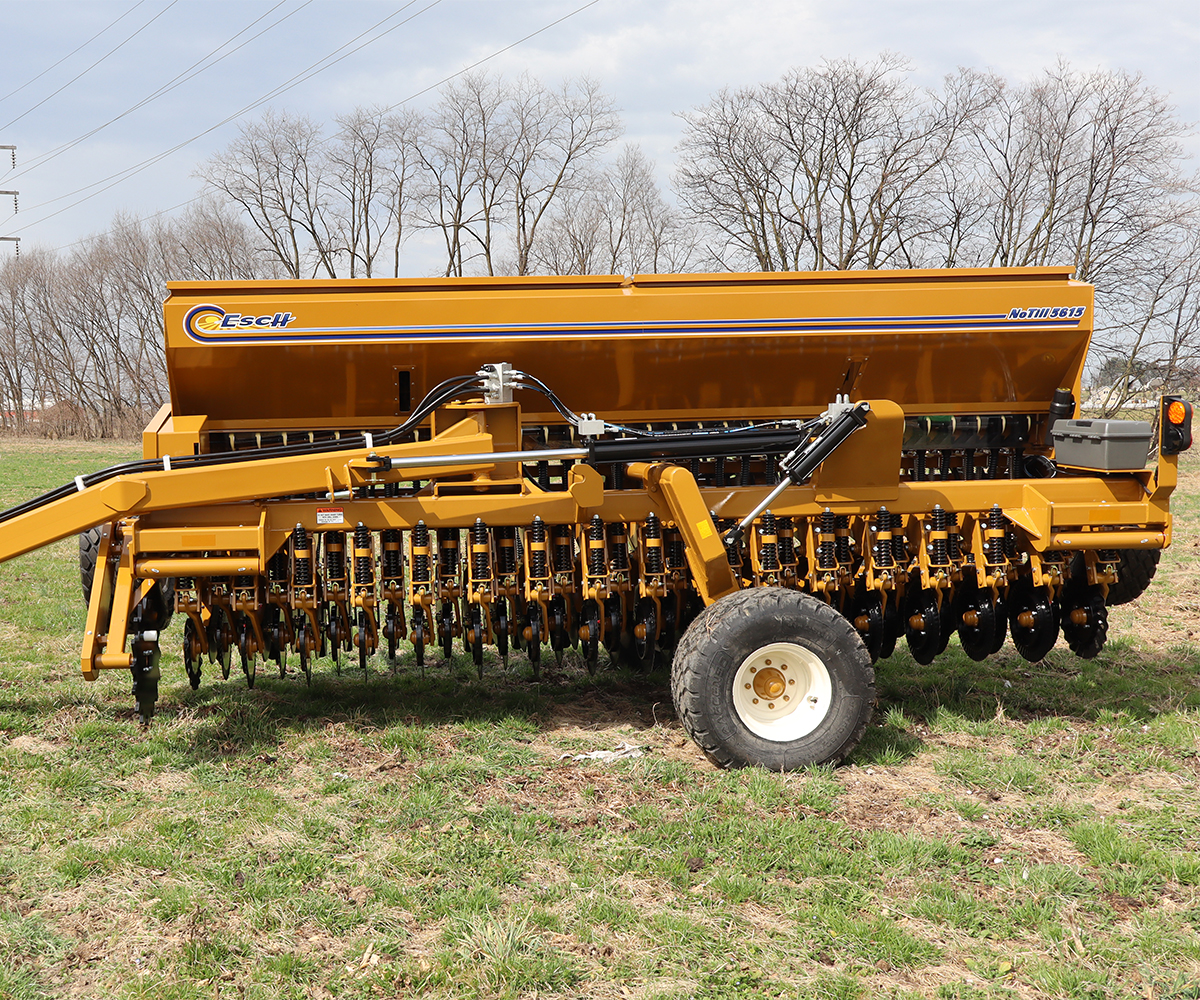 The 5615 Esch Drill features a no-till coulter with tapered roller bearings and a small seed tube behind double disc. It comes with replaceable wear bushings and makes adjusting the seed depth with its T-handle.