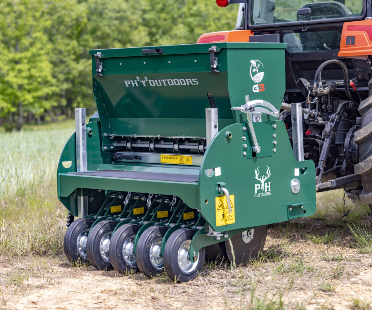 A true no‐till drill that will plant a variety of food plot seeds in the ground even in the toughest soil conditions. The PH Outdoors G-Series No Till Drill features tempered cutting discs spaced that slice into the soil then plants the seeds in the slits that are created by the discs. The slits are then closed by solid rubber packing wheels that trail behind the discs. With the G-Series No Till Drill, you will have outstanding seed to soil contact even when cutting through standing vegetation. The PH Outdoors G-Series Drill leaves no exposed seeds to wash away or be eaten by wildlife. The seeding mechanism is simple to calibrate and extremely accurate even with a variety of seed sizes and blends. All PH Outdoors Drills have a 7.5″ seeding row distance and up to 7.5 mph seeding speed.