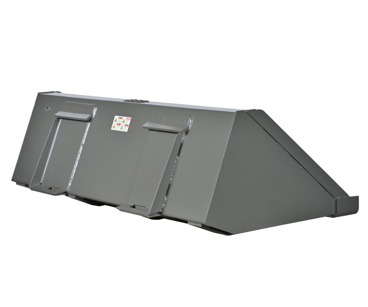For general purpose use. Features a long bottom. The cutting edge is visible from the seat of most skid loaders.